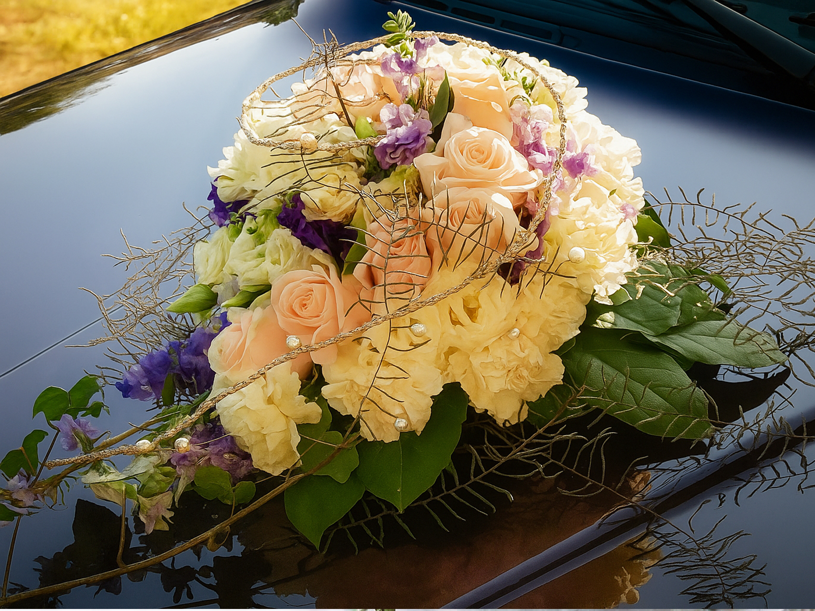 Wir übernehmen die Dekoration von Kirche, Festräumen, Autos und Kutschen nach Ihren Wünschen. Auf Anfrage besichtigen wir die Örtlichkeiten im Voraus, um die Dekoration perfekt abzustimmen. Sollte der Brautstrauß einmal vergessen werden – keine Sorge, wir finden in der Regel auch kurzfristig eine Lösung.
